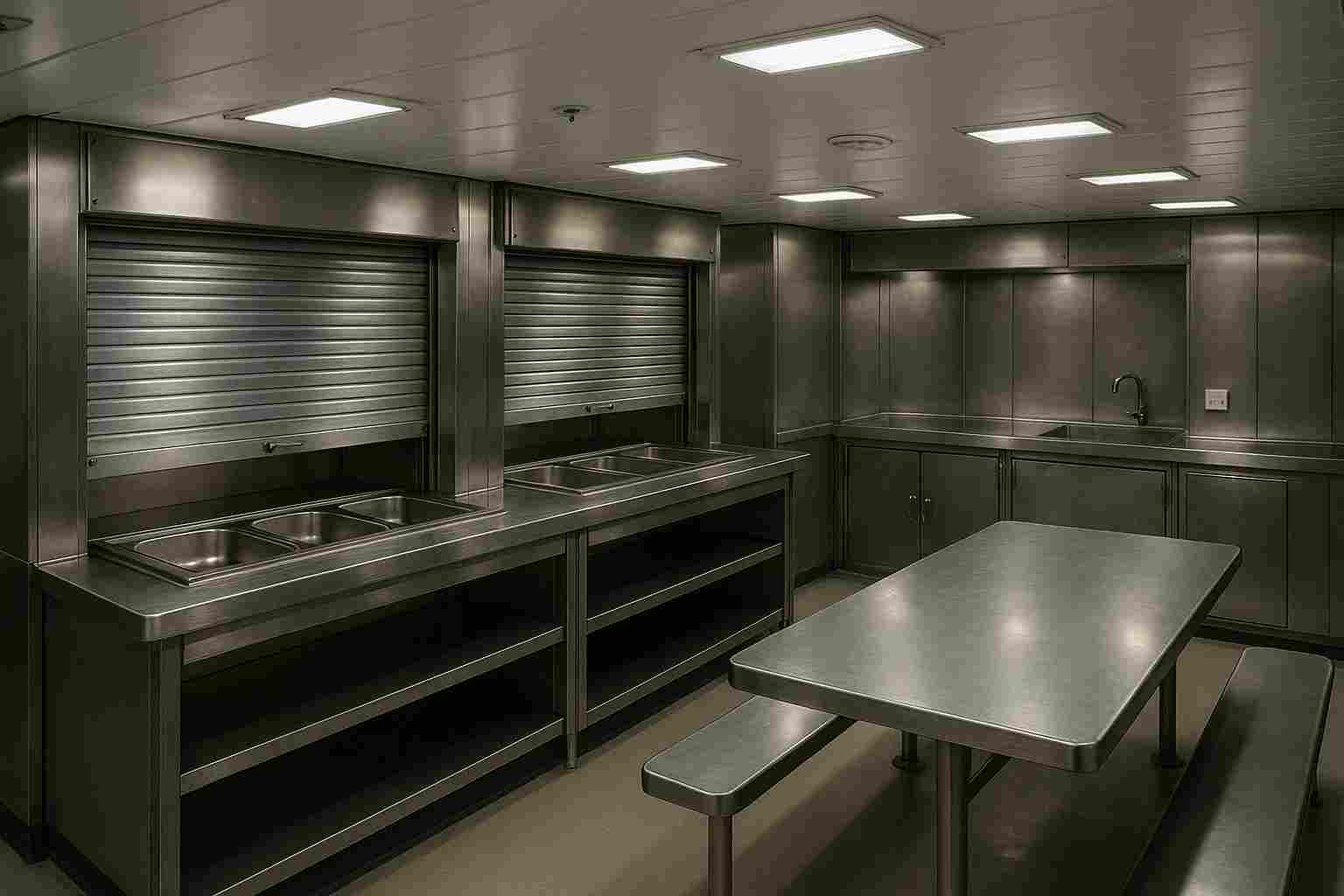 Galley → mess/dining servery hatches(buffet/service counters). |
