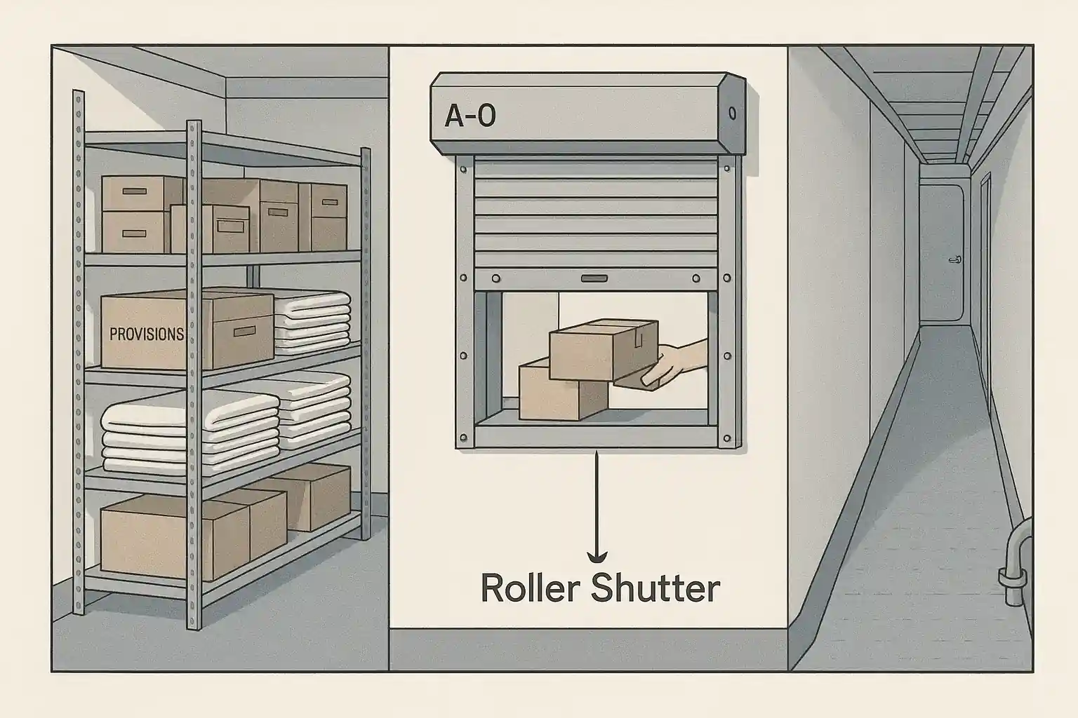 Stores/linen/provision rooms pass-through hatches to passageways for goods transfer. |